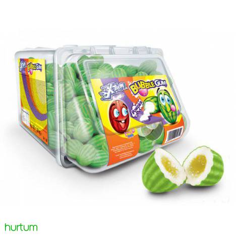 Guma balonowa o smaku arbuzowym z kwaśnym musującym proszkiem. Opakowanie zbiorcze 300 szt. Waga netto 1 sztuki: 6 g.