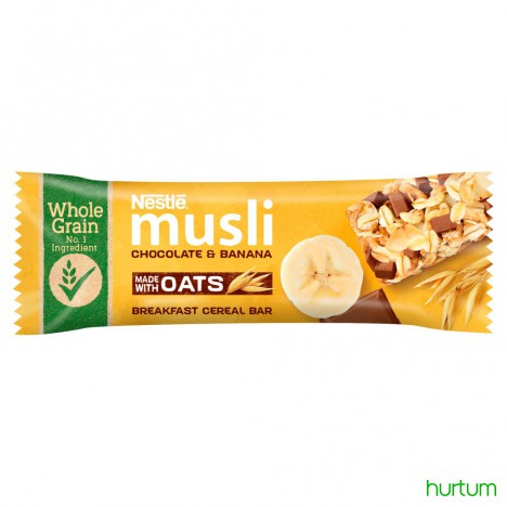 Płatki śniadaniowe musli w formie batonika z mleczną czekoladą i bananami.