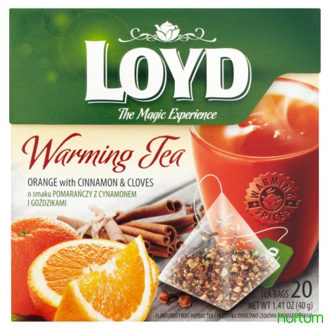 Warming Tea to dokładnie skomponowana mieszanka herbaty ziołowej, pysznych owoców i aromatycznych przypraw. Produkowany ze skrupulatnie dobranych składników owocowy napar o smaku pomarańczy, cynamonu i goździków urzeka głębokim, wyraźnym zapachem oraz zachwyca intensywnym, słodko-korzennym smakiem. Wysublimowany, szlachetny smak cynamonu i słodki aromat pomarańczy oraz delikatna nuta goździków i jeżyny zostały zamknięte w przezroczystych torebkach-piramidkach. Piramidki zapewniają całym listkom herbaty wystarczająco dużo miejsca, aby w pełni mogły się rozwinąć i zaofiarować wyraźny zapach i wyrafinowany smak naparu. Herbatka znakomicie odpręża, jest doskonałą propozycją na chłodne wieczory.
