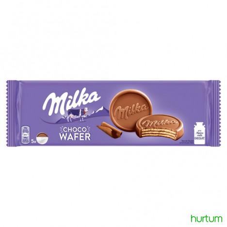 Wafelki z kremem kakaowym (27%) oblany czekoladą mleczną z mleka alpejskiego (60%).