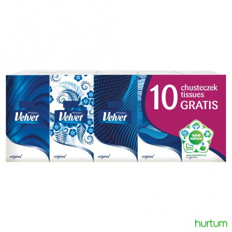 Chusteczki higieniczne Original to produkt charakteryzujący się wyjątkową miękkością, dzięki 4 warstwom delikatnej bibułki. Stworzone zostały dla konsumentów najbardziej wymagających, którzy cenią elegancki wzór w monochromatycznej granatowej kolorystyce marki Velvet. Chusteczki zapakowane są w poręczne małe paczuszki w wygodnym do otwierania klipsem. Produkt jest dostępny w formacie 10x10 szt.