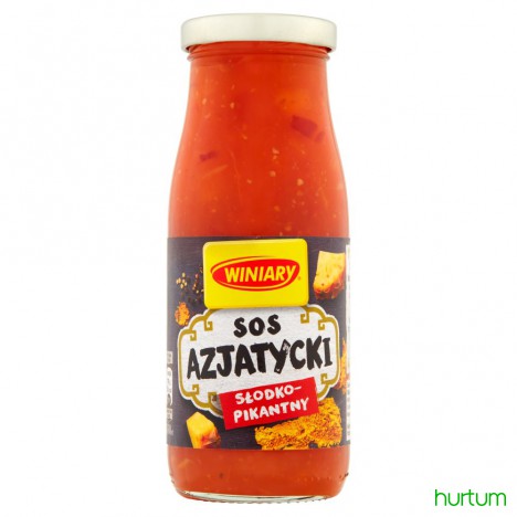 Winiary Sos Azjatycki to słodko-pikantny sos z kawałkami ananasa, przyprawą curry i papryką. Nada on orientalnego charakteru codziennym przekąskom i daniom. Polecany do drobiu, warzyw, ryb, sajgonek, ryżu lub jako dip. Do stosowania na zimno jak i na ciepło.