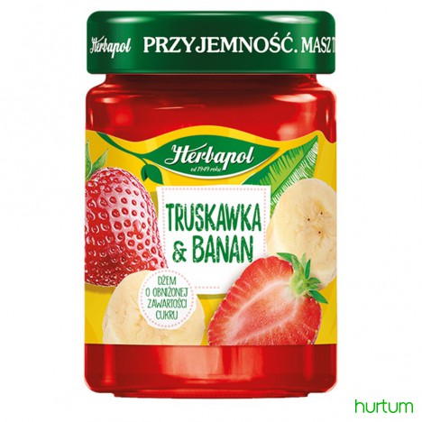 Dżem truskawka z bananem o obniżonej zawartości cukru*. Pasteryzowany.