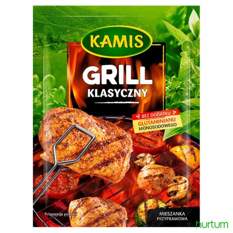 Przyprawa Grill klasyczny Kamis wzbogaca smak i aromat dań przyrządzanych na ruszcie lub patelni, a gruboziarnista struktura mieszanki nadaje potrawom atrakcyjny wygląd. W skład mieszanki wchodzą między innymi takie przyprawy jak: czosnek, majeranek, liście laurowe. Na jej bazie przyprawy można przygotować aromatyczną marynatę, mieszając 1/3 szklanki oleju z 3 łyżkami mieszanki Grill klasyczny Kamis.