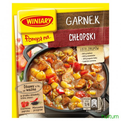 Winiary Pomysł Na… Chłopski garnek to propozycja na codzienny i sycący obiad dla całej rodziny inspirowany kuchnią polską. Do jego przygotowania potrzeba ulubionych polskich składników: ziemniaków, kapusty, kiełbasy i papryki. Dzięki aromatycznej mieszance suszonych warzyw i przypraw danie jest doskonale przyprawione. W połączeniu z świeżymi warzywami może być częścią zbilansowanego i wartościowego posiłku.