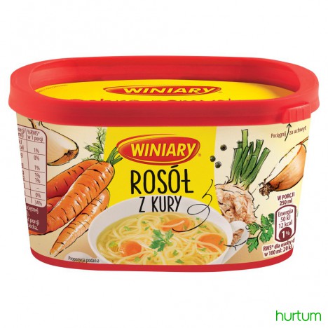 Winiary Rosół z kury instant to zupa uniwersalna, na każdą okazję, często potrzebna w kuchni, a to, co najbardziej potrzebne, powinno być zawsze pod ręką. Zadbaliśmy więc o to, by w Twojej kuchni nigdy nie zabrakło smaku tego lubianego przez rodzinę rosołu. Winiary Rosół z kury instant umieściliśmy w dużym, wygodnym opakowaniu, możesz więc używać go według potrzeb i upodobania: jako szybką przekąskę, z dodatkiem makaronu na obiad, lub jako bazę do Twoich domowych zup. Po wykorzystaniu zupy, pusty kontenerek świetnie sprawdzi się również jako pojemnik na przyprawy.